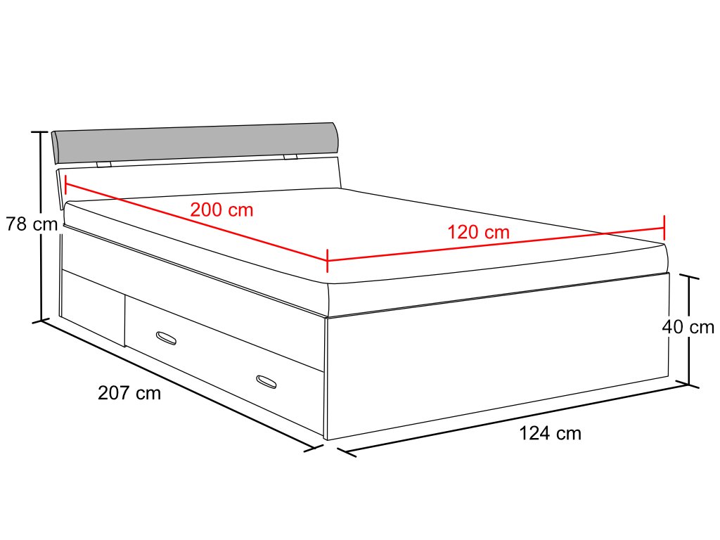 Gesamtmaße des Bettes: 207 x 124 x 78 cm