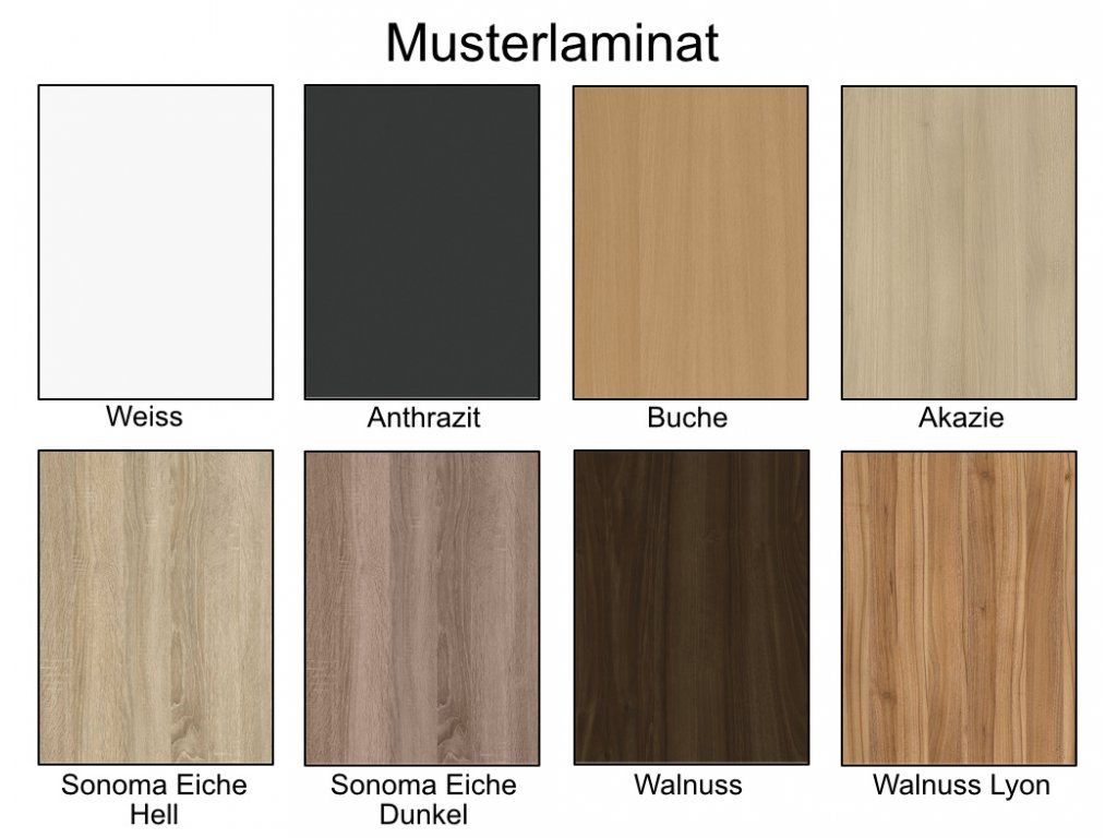 Farblaminat: | BUCHE, WEISS, WALNUSS, WALNUSS LYON, EICHE SONOMA, ANTHRAZIT, AKAZIE |