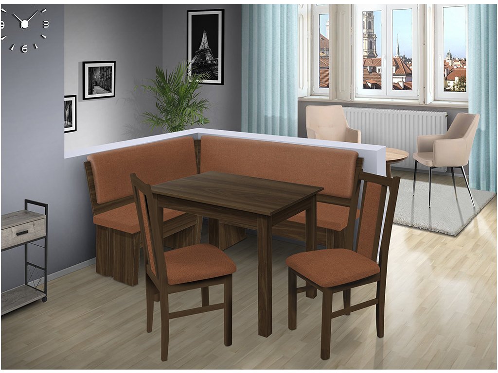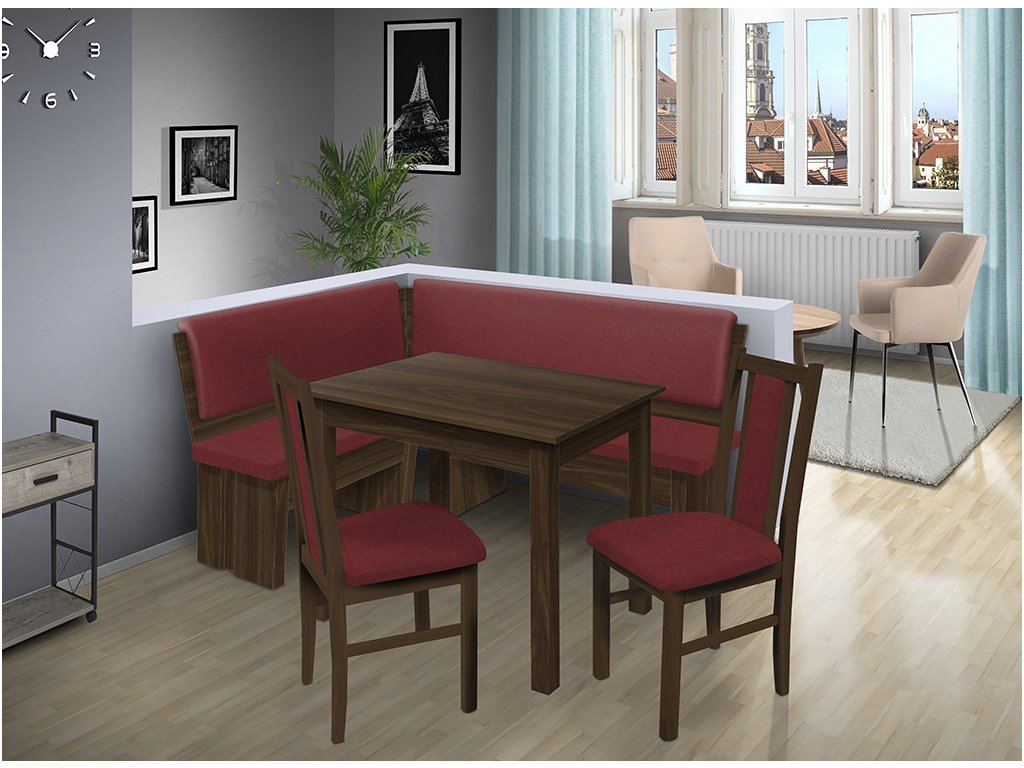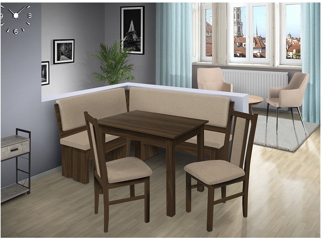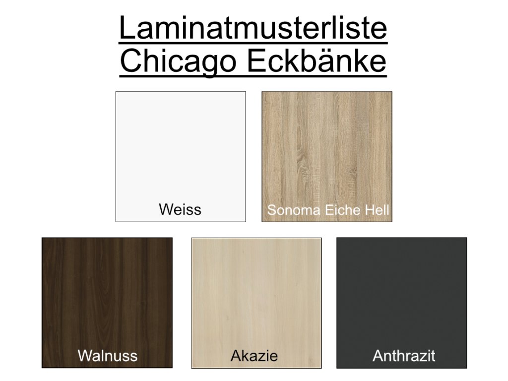 Die Chicago Eckbank, der Tisch und die Hocker sind aus strapazierfähigem 18-mm-Laminat gefertigt, das eine lange Lebensdauer und Stabilität gewährleistet. ABS-Kanten verleihen der gesamten Struktur Festigkeit und Widerstandsfähigkeit gegen Beschädigungen. Die Stühle sind aus Massivholz im Farbton des gewünschten Laminats gefertigt. Die Polsterung ist für das gesamte Set immer identisch.